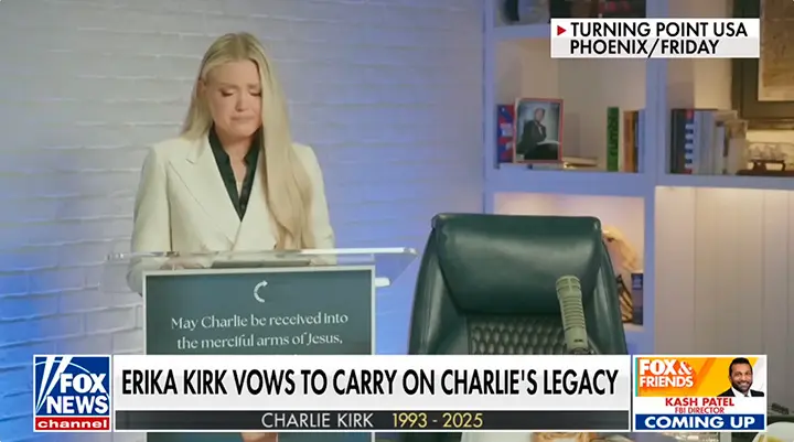 Charlie Kirk's widow vowed to continue his conservative activism, ensuring Turning Point USA's fall campus tour and December AmericaFest conference proceed. She declared that the assassins, who silenced his message of patriotism, faith, and God's love, have unknowingly unleashed a greater movement by killing a martyr. Her cries, she said, will echo worldwide as a battle cry, amplifying his mission.